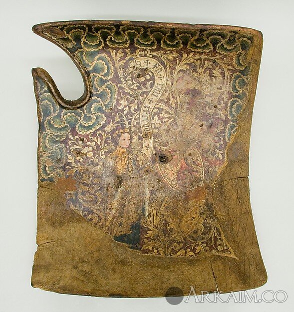 Несмотря на повреждения от использования и возраста, этот щит является одним из самых красиво окрашенных примеров пятнадцатого века. На сохранившейся поверхности изображена женщина в тюрбане с перьями которая держит свиток с надписью на немецком языке "путешествует с радостью" (идти с радостью). Геральдический щит справа ранее отображал герб владельца оружия, но теперь он неразборчивый.