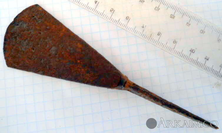 Срезень в виде узкой вытянутой лопаточки сдугообразным острием, тип 67 вар. 2 по Медведеву, 13-14 вв. Крым