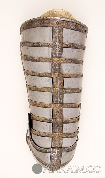 Изначально набедренник был утерян и тогда была созданна данная копия. Но в 1922 году оригинальный набедренник был куплен на аукционе и заменил данный в доспехе.