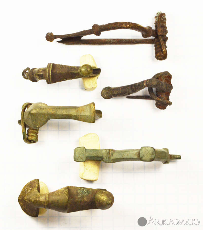 Фибулы, черняховская культура, размеры сверху вниз - 5,7см; 3,5см; 3,3 см; 3,5см; 5см; 4см. Житомирская обл.