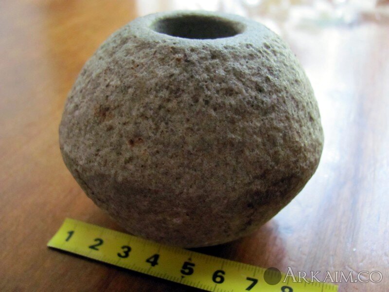 Булава каменная, биконическая, круга культуры Шнуровой Керамики, 3 тыс. до н.э. Булава недосверленная, диаметр отверстия 23 мм, диаметр булавы - 75 мм. Вес-507 грамм. Винницкая обл. (фото 1)