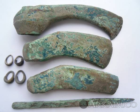Вещевой клад Катакомбной культуры, пара височных подвесок из серебра, вторая пара из бронзы, топоры скорее всего из меди, или бронзы с крайне малым содержанием олова. Клад был найден на территории Полтавской области. Предметы находились в горшке.