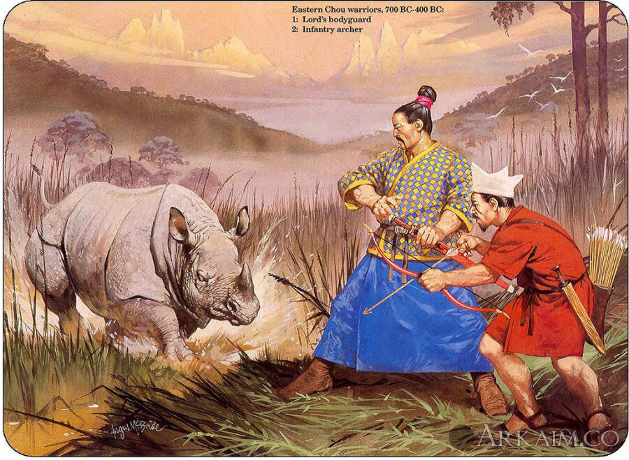ancient chinese warriors Of The zhou dynasty fighting against A rhinoceros