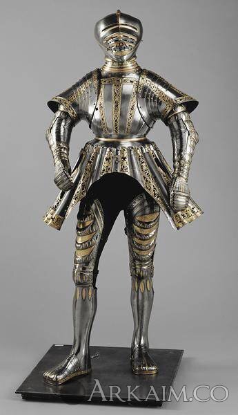 Хорошо видны «рукава» и имитация модных тогда разрезов на латах выше колен. «Юбка» использовалась для пеших поединков, но в этом случае к ней пристегивались дополнительные детали спереди и сзади. Ну, а для верховой езды, соответственно, они отстегивались, что позволяло рыцарю взгромоздиться в седло.