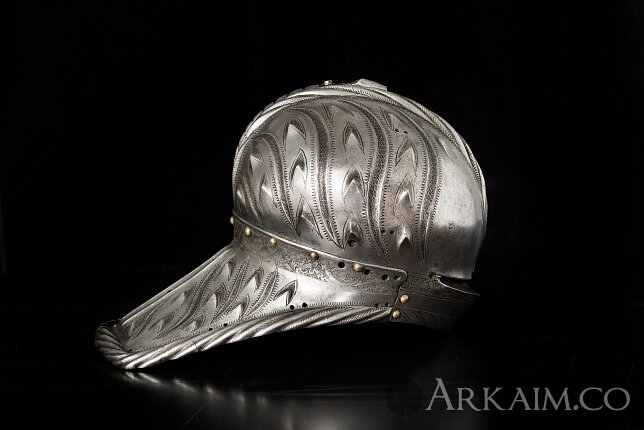 Сталь, ткань, кожа, латунь, ковка, выколотка по форме, резьба, травление, гравировка. Высота - 25 см; ширина - 23 см; длина - 37 см.