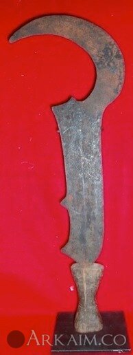 Этот меч называется нгала или бангала.Заир.Назван он по названию станции на реке Конго.Это название станции дали монахи-миссионеры,у которых там была миссия.Данное название впоследствии закрепилось за обширной территорией вокруг,где жили племена объединённые в одну языковую группу.Мечи этой формы использовались для казни рабов во время жертвоприношения.Эти жертвы приносились по торжественному случаю заключения мира между враждовавшими до этого племенами.Казнь считалась как необходимая церемония при заключении мира у племён,проживавших в данной местности.Эти племена верили,что если не казнить раба,то мир,который они заключили между собой будет хрупкий и не долгий.По своему нраву жители этой области долины реки Конго были свирепы,занимались грабежом соседей.После жертвоприношения тело человека расчленялось и употреблялось в пищу.После бельгийской колонизации этот обычай был запрещён, и нгала человека заменили на козу.Этот меч используется в танце называемым Ликбети.Он может продолжаться около двух дней.