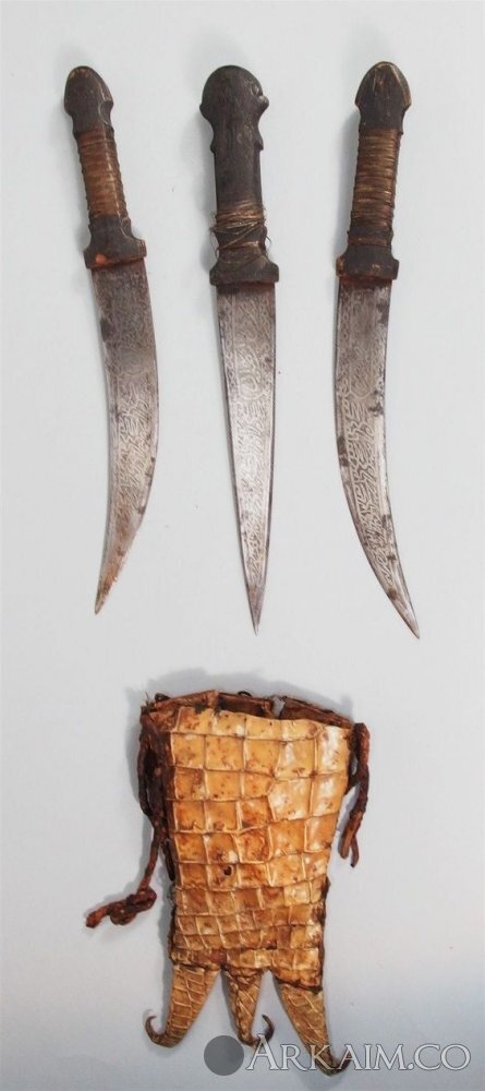 Два крайние кинжала одинаковые по форме но расположены зеркально. Тот, который левее использовался для нападения, тот, что правее - для защиты.