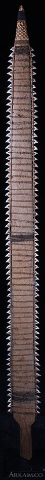 Дубинка с островов Гилберта. Длина 135 см, ширина 35 см. Сделана из кокосовой пальмы. Шнур, которым крепятся зубы акулы сделан из пальмового волокна с добавлением женских волос (фото 6)