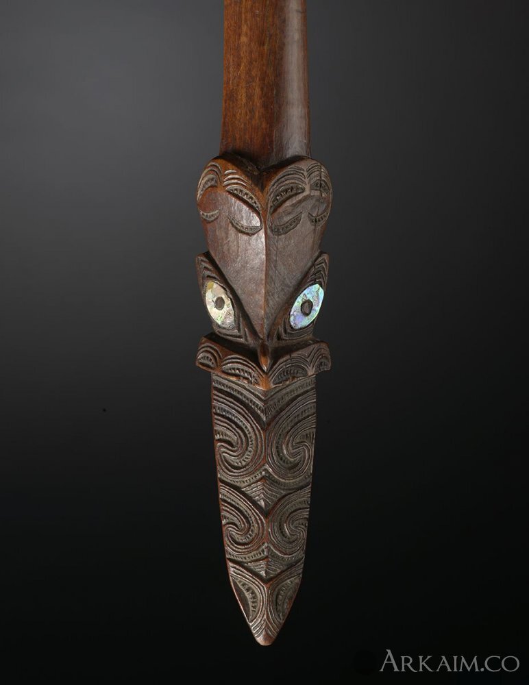 Тэ-э-ха. Через дефис написал как правильно произносят маори название своей дубинки. Обычно пишут одним словом тээха, но при произношении по русски надо отделять звуки. Размер тээхи от 1,5 до 1,8 м. Это оружие ближнего боя. Рабочих оба конца. Предназначена для нанесения колющих и дробящих ударов. Наконечник делается из дерева, базальта и нефрита. Он символизирует высунутый язык.