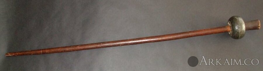 Каменная дубинка с острова Новая Британия, Архипелаг Бисмарка. В длину она 110 см. Камень на голове дубинки крепился деревянными клиньями и заливался смолой (фото 3)