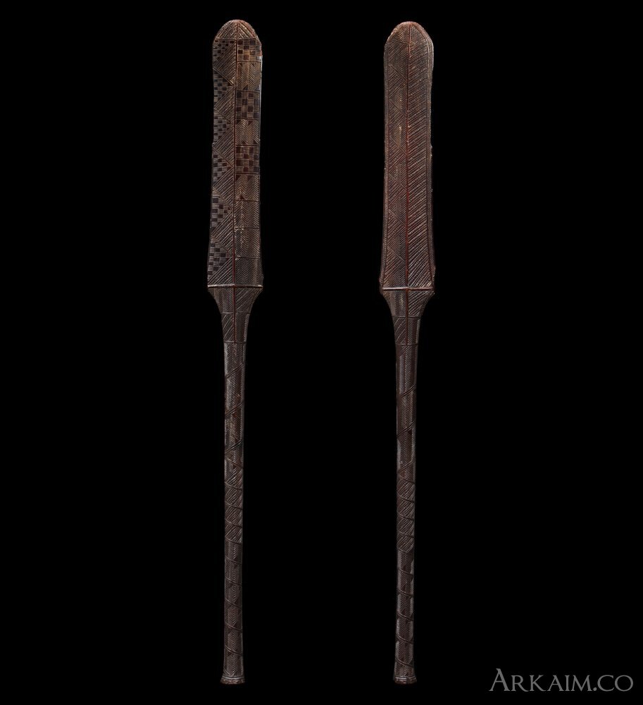 Этот тип дубинок с Тонга относится к тому же типу что и паки паки. Только здесь другая форма лопасти. Хотел бы обратить внимание на одну деталь. Орнамент вырезанный с двух сторон лопасти дубинки разный. Это характерно для Тонга