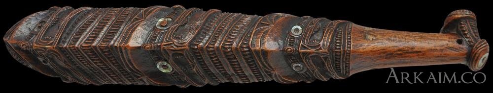 Метательная дубинка маори patuki. В длину она была 25-35 см. Дубинки украшенные резьбой и большей длины (до 50 см) выполняли ритуальную функцию. Делали их из дерева и китового уса.