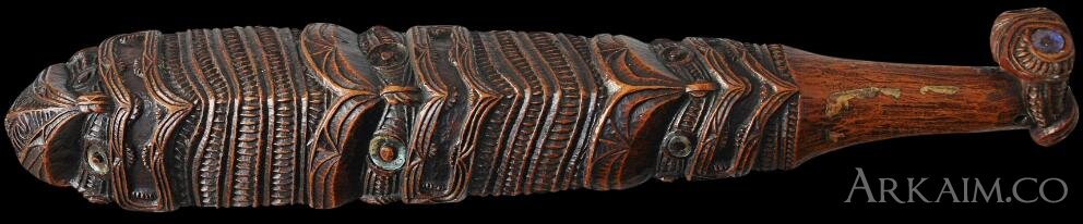 Метательная дубинка маори patuki. В длину она была 25-35 см. Дубинки украшенные резьбой и большей длины (до 50 см) выполняли ритуальную функцию. Делали их из дерева и китового уса.