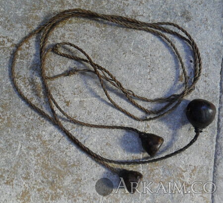 Болас. Количество камней в нём было от 2 и до 8-9 шт. Были парадные варианты этого оружия, сделанные из слоновой кости и украшенные серебром. Форма и вес камней могли быть разными. Камни для боласа специально оттачивали. Они были двух видов. Одни гладкие, их зашивали в мешок, на других делали посередине углубление для шнура, что бы завязать камень