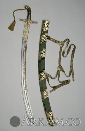 Ножны и рукоять сабли оправлены ажурными серебряными накладками, сквозь которые просвечивает зеленый бархат. Декор мощного широкого клинка из дамасской стали удивительно соответствует его форме. Вдоль клинка выточен широкий дол c резным орнаментом из покрытых золотом и серебром цветочных листьев.