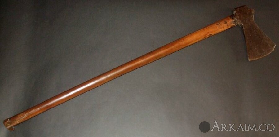 Топор с Вануату. Длина рукояти от 80 до 90 см. Для танцев делали аналогичной длины и формы деревянные топоры. С приходом европейцев на Вануату, там практически сразу прижился европейский топор. Только форма рукояти осталась туземной. Топор на фото 19-начало 20 века