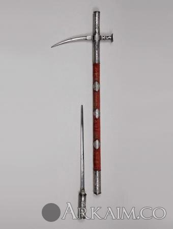 Одним из видов ударного оружия, широко распространенного в русской поместной коннице, был чекан. Его характерный клинок в виде клюва был рассчитан на поражение противника, облаченного в кольчатый или пластинчатый доспех. В витрине представлен чекан XVII века с четырехгранным клинком с узкими глубокими долами. Серебряный, золоченый прибор его рукояти искусно украшен резным растительным узором.
