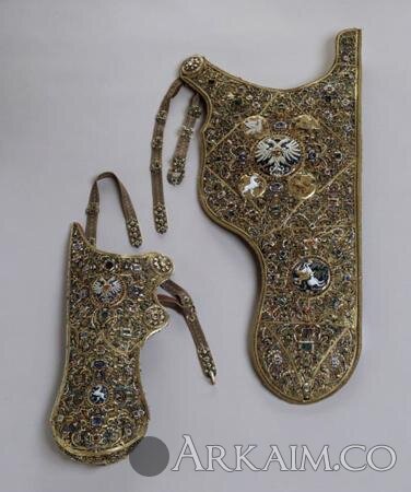 Государственную значимость саадака подчеркивают геральдические изображения, выполненные в технике эмали. В верхней части налуча в центральном клейме помещен герб России - двуглавый орел под тремя коронами. Вокруг него изображены: одноглавый белый орел с короной в когтях, грифон с державой, единорог со скипетром и лев с мечом. В нижней части налуча помещена древняя эмблема великих князей Московских - воин на коне, поражающий копьем дракона. На колчане изображен двуглавый орел и единорог. Среди растительного орнамента саадака сверкают драгоценные камни - алмазы, сапфиры, рубины и изумруды.