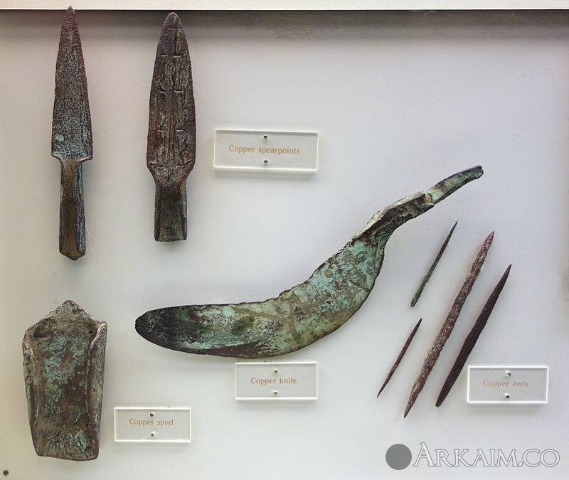 Наконечники копий, мотыжка, серп и проколки. Изделия из меди. Исторический музей штата Висконсин, США.