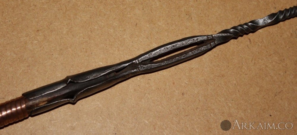 Копьё из долины реки Конго. Оснащёно оно медным листовым наконечником, который мог использоваться как нож или гарпун, и длинной пикой (втоком)