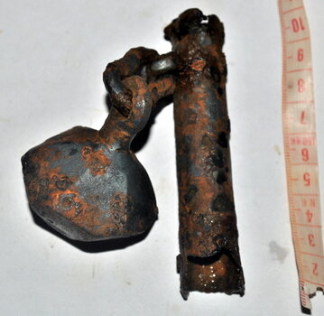 Кистень с ушком и перехватом прикрепленный к остаткам рукояти, 2 тип 2 вариант по Колчеву, вторая половина 8 - 10 вв. Харьковская обл.
