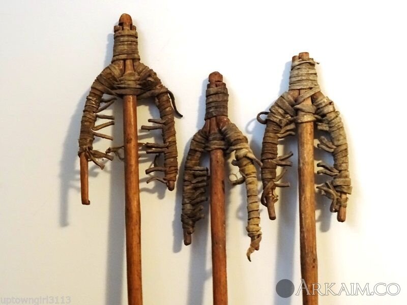 Три коротких копья, длинною около 1 м, которые бросались только с помощью копьеметалки. На конце древка специально вырезаны позы для неё. Форма наконечников очень самобытна. К сожалению назначение таких копий не понятно. Новая Гвинея (фото 1)