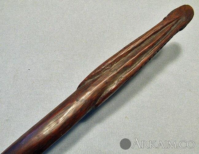 Копьё полностью деревянное. По его внешнему виду можно предположить, что оно имело какие-то ритуальные функции. Копьё вырезано целиком из одного ствола. С одной стороны широкий листовидный наконечник, с другой изображение крокодила, видимо тотемного животного. Новая Гвинея (фото 1)