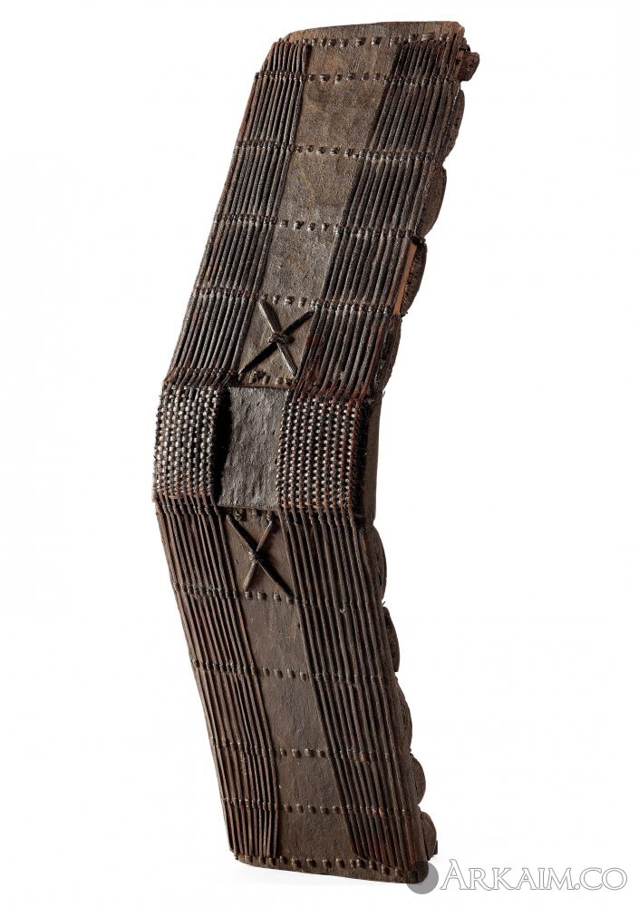 Щит народности топоке. Бассейн реки Конго. Заир. Щит сделан из дерева или плетённый, иногда обклеивался кожей. Длина 1-1,2 м. V-образная форма с небольшим изгибом