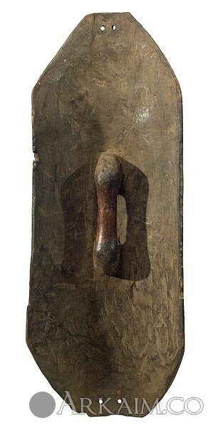 Щит племени нгони из Конго. Нгони относятся к зулусам. Их в Замбии называют ангони. Зулусы расселились компактными группами в Танзании, Заире. Их типичное вооружение в других климатических зонах оказалось не эффективным. Они перенимали у соседних племён что могли. То же коснулось и щита. В Заире он стал деревянным. В центре вырезалась деревянная рейка, рукоять делалась отдельно и привязывалась кожаным шнурком. Длина щитов от 70 см и до 90 см.