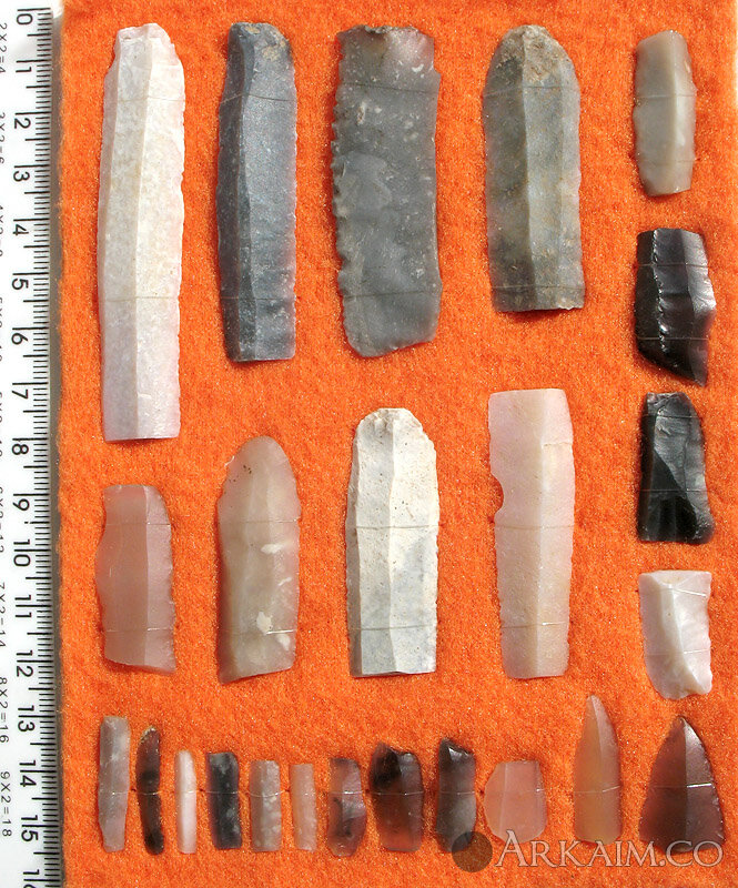 Подборка микролитов, ножевидных пластин и вкладышей с ретушью.