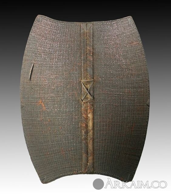 Щит из Юго-Западного Камеруна. Народность мамбилла. Щиты большое по размеру. В длину от 70-120 см, в ширину 50-90 см. Щиты сплетены из пальмового волокна и тростника, которыми оплетают деревянный каркас.