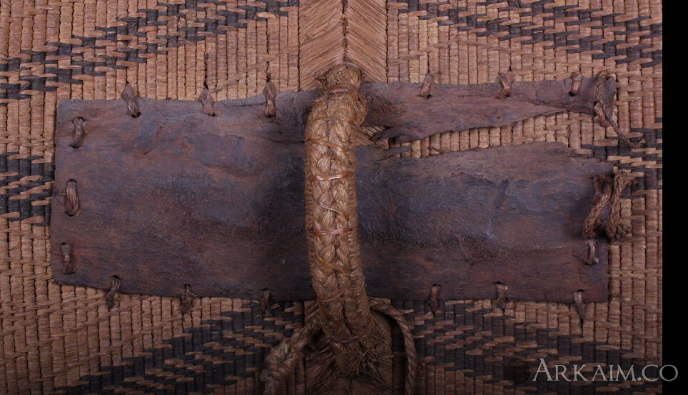 Щит из Юго-Западного Камеруна. Народность мамбилла. Щиты большое по размеру. В длину от 70-120 см, в ширину 50-90 см. Щиты сплетены из пальмового волокна и тростника, которыми оплетают деревянный каркас.