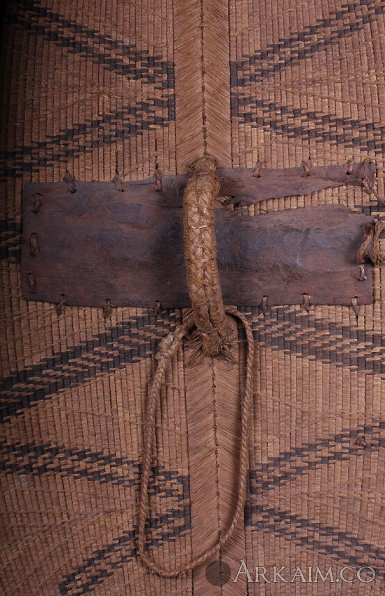 Щит из Юго-Западного Камеруна. Народность мамбилла. Щиты большое по размеру. В длину от 70-120 см, в ширину 50-90 см. Щиты сплетены из пальмового волокна и тростника, которыми оплетают деревянный каркас.