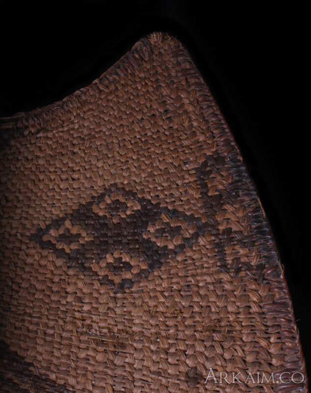 Щит из Юго-Западного Камеруна. Народность мамбилла. Щиты большое по размеру. В длину от 70-120 см, в ширину 50-90 см. Щиты сплетены из пальмового волокна и тростника, которыми оплетают деревянный каркас.