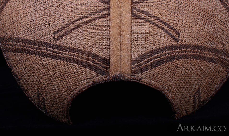 Щит из Юго-Западного Камеруна. Народность мамбилла. Щиты большое по размеру. В длину от 70-120 см, в ширину 50-90 см. Щиты сплетены из пальмового волокна и тростника, которыми оплетают деревянный каркас.