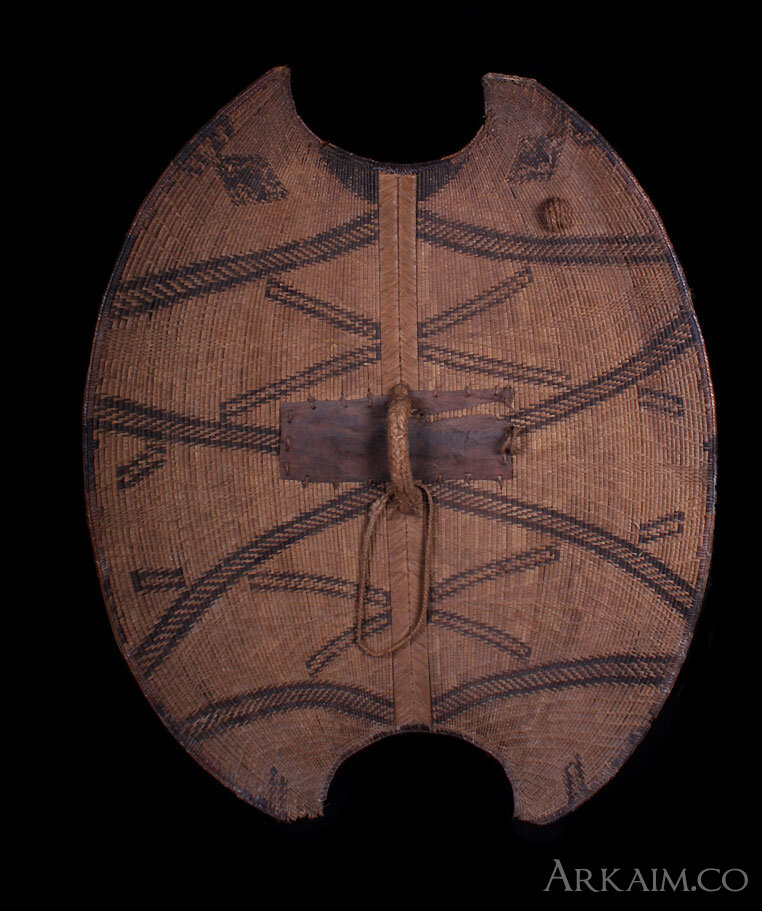 Щит из Юго-Западного Камеруна. Народность мамбилла. Щиты большое по размеру. В длину от 70-120 см, в ширину 50-90 см. Щиты сплетены из пальмового волокна и тростника, которыми оплетают деревянный каркас.