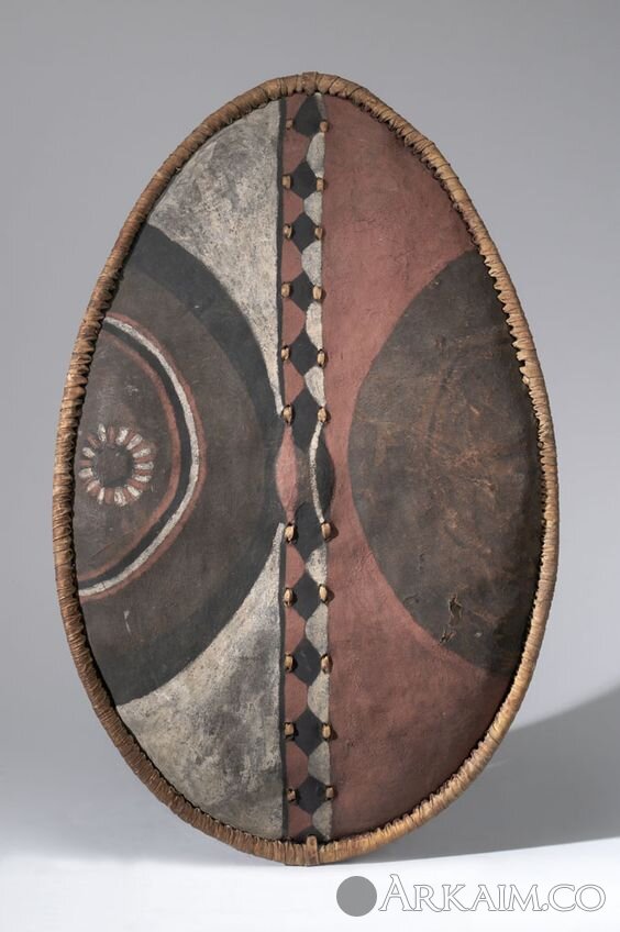 Щиты масаев. По тому в какие цвета раскрашен щит масая можно было понять его место в иерархии. Молодые воины имели право пользоваться только белым, чёрным и серым цветами.