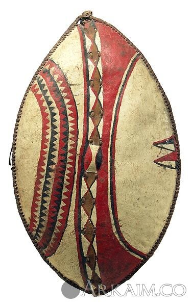 Щиты масаев. По тому в какие цвета раскрашен щит масая можно было понять его место в иерархии. Молодые воины имели право пользоваться только белым, чёрным и серым цветами.