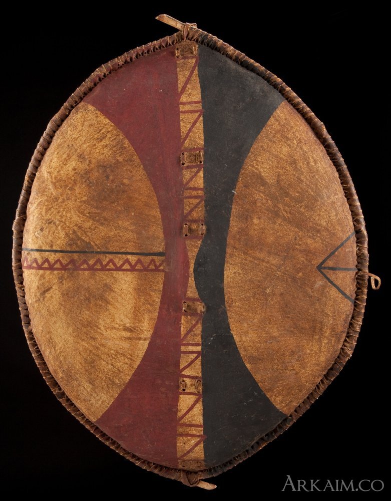 Щиты масаев. По тому в какие цвета раскрашен щит масая можно было понять его место в иерархии. Молодые воины имели право пользоваться только белым, чёрным и серым цветами.