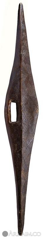 Подобные щиты служили для парирования копий, которые бросались несколькими людьми в обидчика во время исполнения мести. Человек, который заслужил месть становился лицом к солнцу и парировал брошенные в него копья.