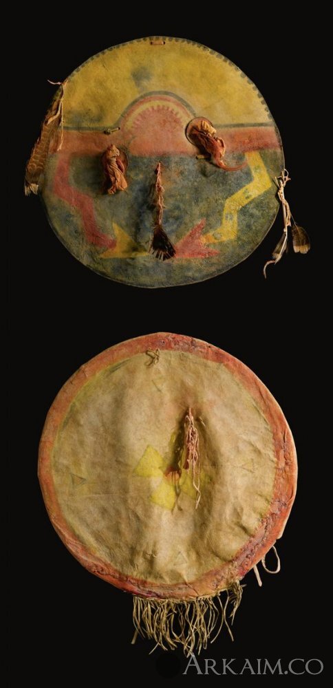 Щит северо-американских индейцев. Боевые щиты были большего размера, в диаметре 55-65 см. Танцевальные около 40 см. На щитах были нарисованы символы, которые касались не только племени, но и самого владельца.