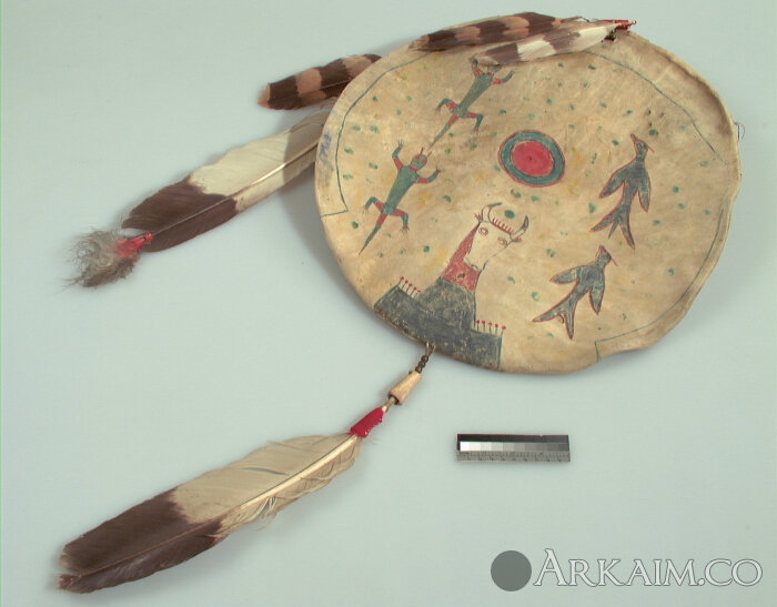 Щит северо-американских индейцев. Боевые щиты были большего размера, в диаметре 55-65 см. Танцевальные около 40 см. На щитах были нарисованы символы, которые касались не только племени, но и самого владельца.