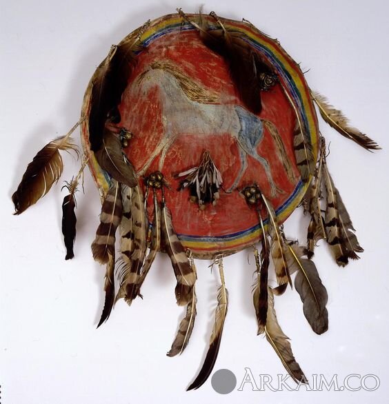 Щит северо-американских индейцев. Боевые щиты были большего размера, в диаметре 55-65 см. Танцевальные около 40 см. На щитах были нарисованы символы, которые касались не только племени, но и самого владельца.