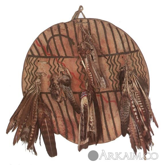 Щит северо-американских индейцев. Боевые щиты были большего размера, в диаметре 55-65 см. Танцевальные около 40 см. На щитах были нарисованы символы, которые касались не только племени, но и самого владельца.