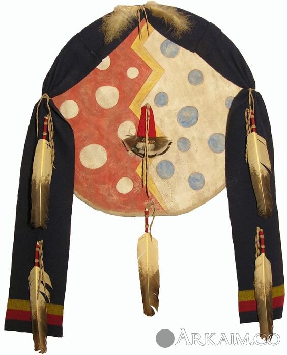 Щит северо-американских индейцев. Боевые щиты были большего размера, в диаметре 55-65 см. Танцевальные около 40 см. На щитах были нарисованы символы, которые касались не только племени, но и самого владельца.