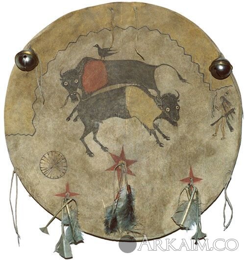 Щит северо-американских индейцев. Боевые щиты были большего размера, в диаметре 55-65 см. Танцевальные около 40 см. На щитах были нарисованы символы, которые касались не только племени, но и самого владельца.