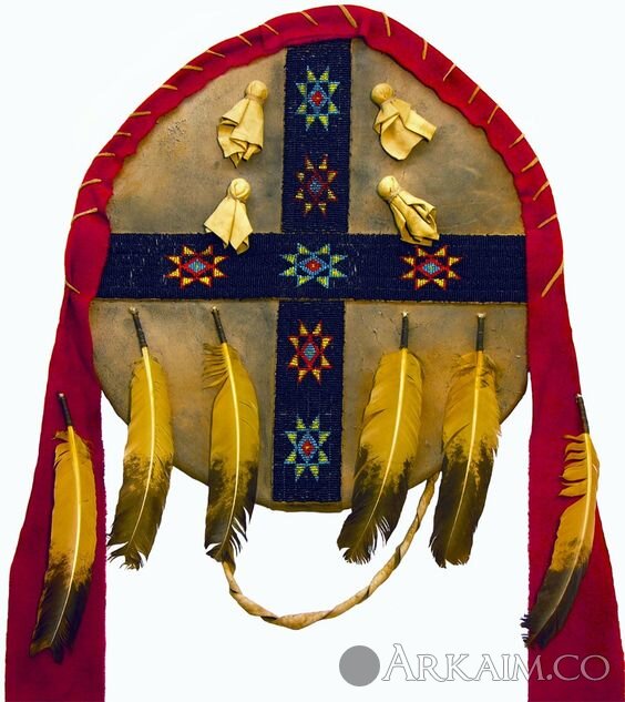 Щит северо-американских индейцев. Боевые щиты были большего размера, в диаметре 55-65 см. Танцевальные около 40 см. На щитах были нарисованы символы, которые касались не только племени, но и самого владельца.