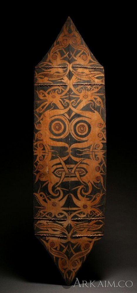 Щит даяков с Борнео. Старые боевые щиты были большого размера. Украшались они иногда снаружи человеческими волосами, срезанными с отрубленных голов. По размеру они отличались у морских и горных даяков