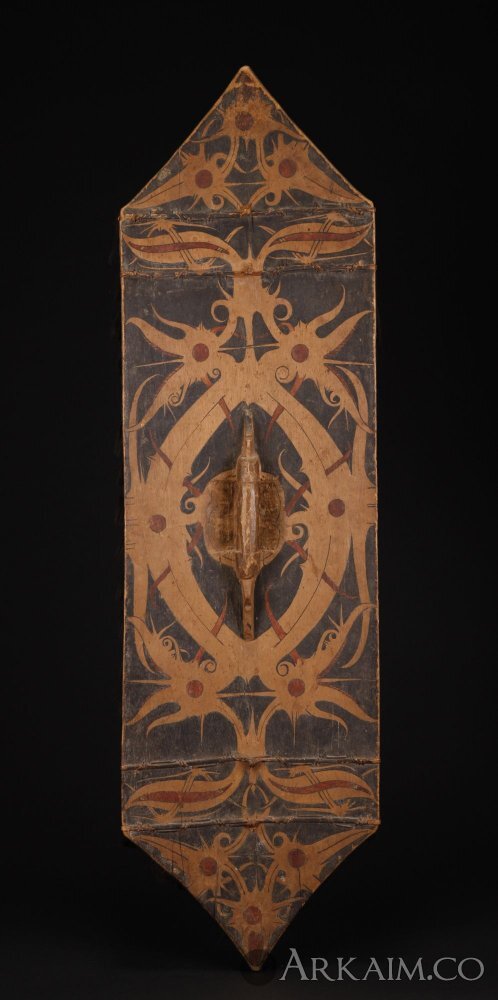 Щит даяков с Борнео. Старые боевые щиты были большого размера. Украшались они иногда снаружи человеческими волосами, срезанными с отрубленных голов. По размеру они отличались у морских и горных даяков