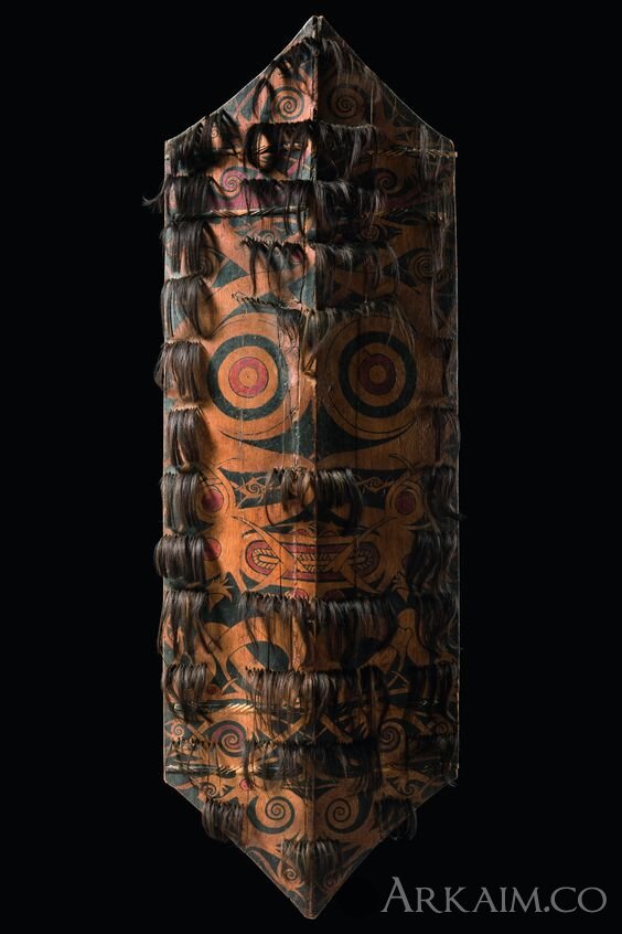 Щит даяков с Борнео. Старые боевые щиты были большого размера. Украшались они иногда снаружи человеческими волосами, срезанными с отрубленных голов. По размеру они отличались у морских и горных даяков